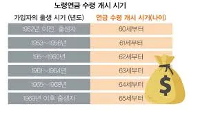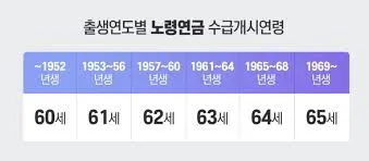 이렇게 출생 연도에 따라 연금 수급 나이가 점진적으로 증가하고 있으며, 1969년생 이후부터는 65세가 수급 개시 연령으로 고정됩니다.