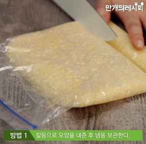 2. 칼등을 이용해 평평하게 펴고 원하는 모양으로 나눈 후, 냉동실에 보관합니다.