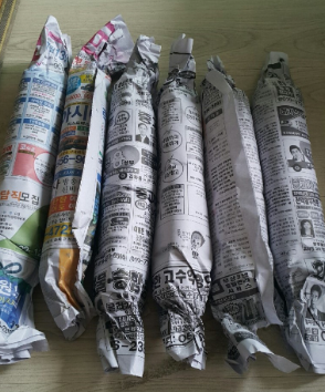 2. 신문지를 깔고 말린 마늘을 나란히 놓은 후 돌돌 말아 주세요.