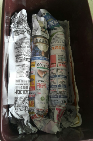 4. 플라스틱 통에 신문지를 여러 장 깔고, 말아 둔 마늘을 넣습니다.